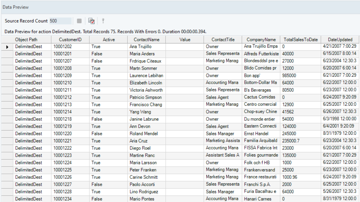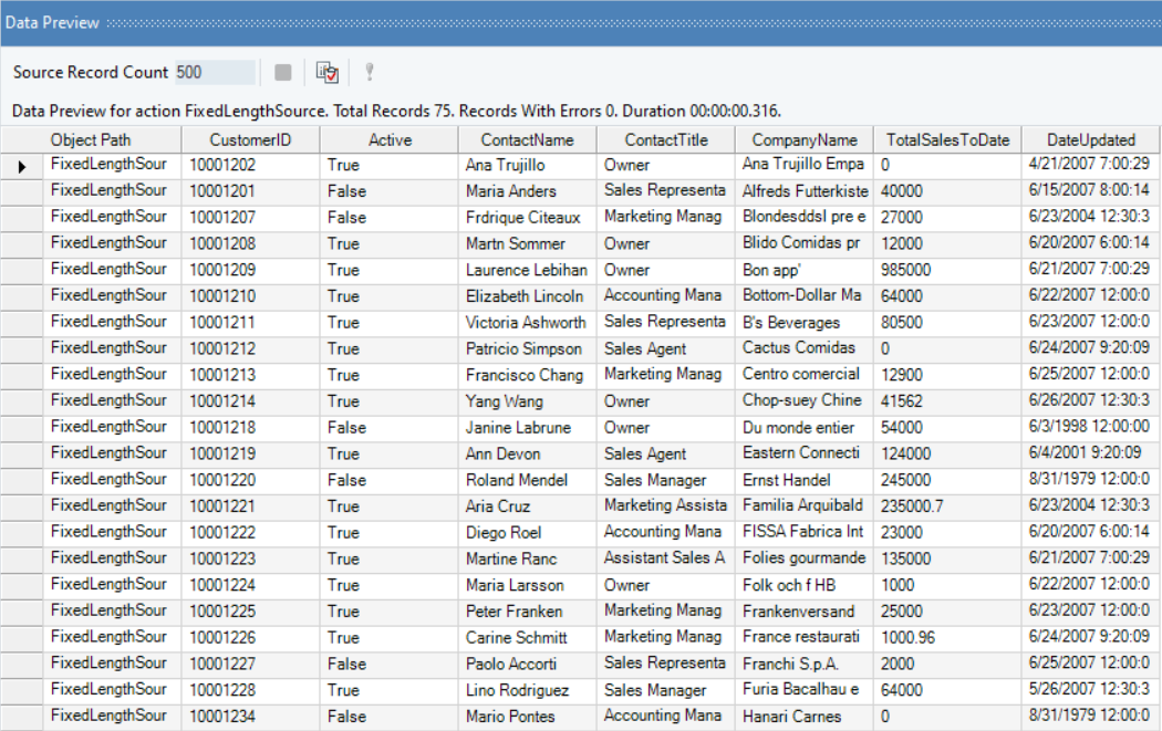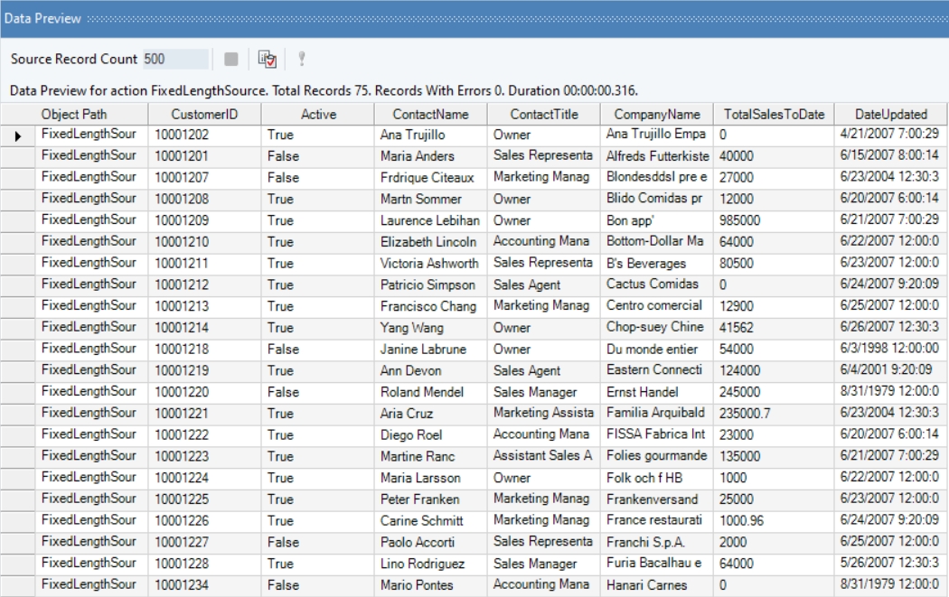 Our data is stored in a Fixed Length File Source object, and look like this:
