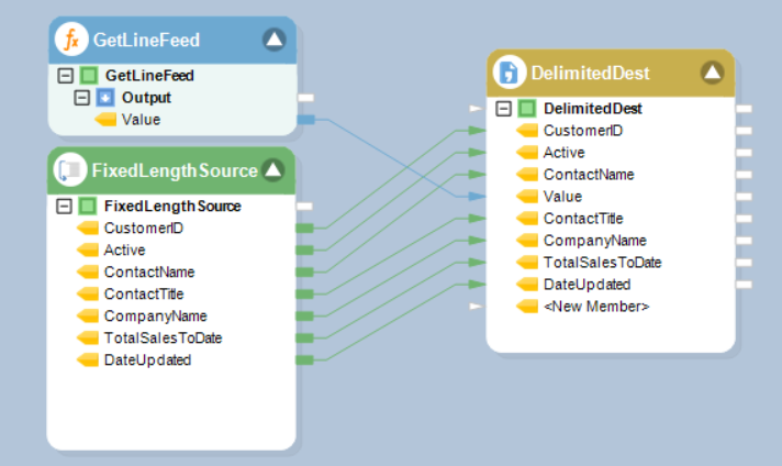 Now, we will map source fields and the output value of the function transformation object to a Delimited File Destination.