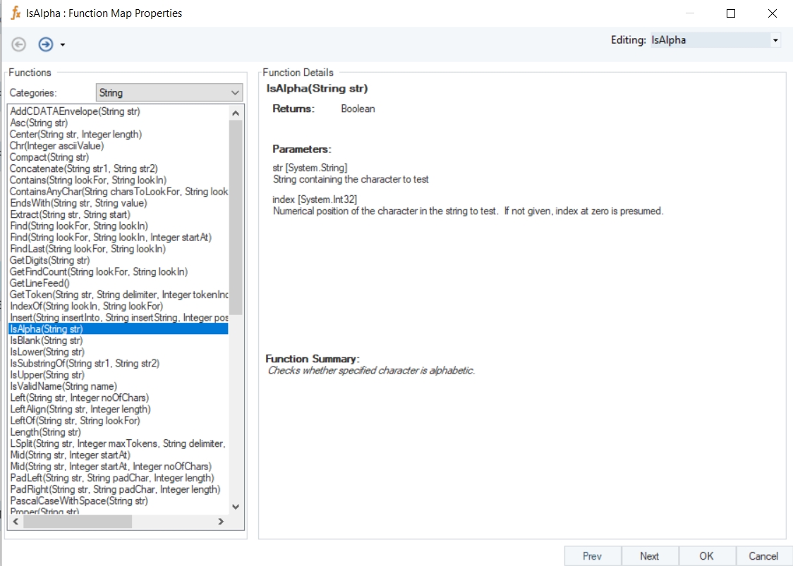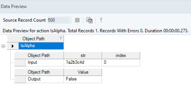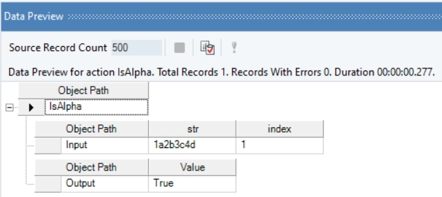 Right-click on the function transformation object and select Preview Output. You can see that Astera Data Stack has returned “True”, as the character in the specified numerical position is alphabetical.
