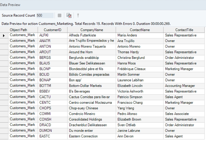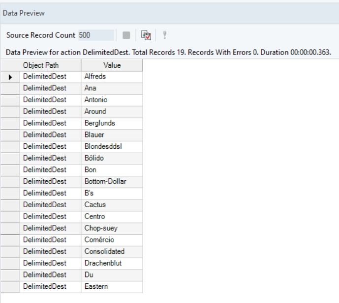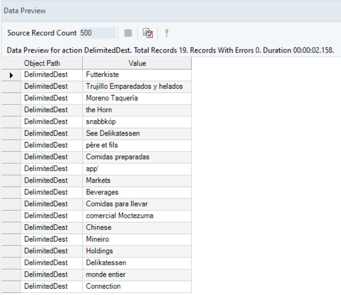 Now, to view the output, we will right-click on the destination object’s header and select Preview Output. You can see that Astera Data Stack has split the string values in the CompanyName field, and returned only the first part of the split string.