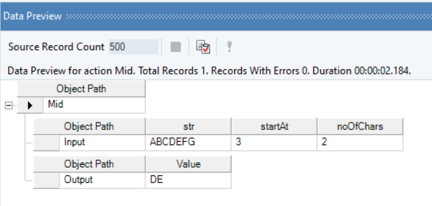 Right-click on the function transformation object and select Preview Output. You can see that Astera Data Stack has returned a string beginning from the specified startAt position, and of specified noOfChars length.