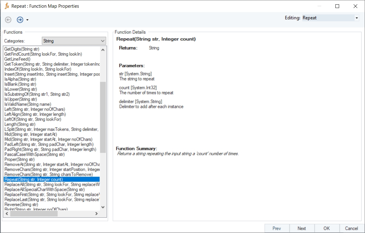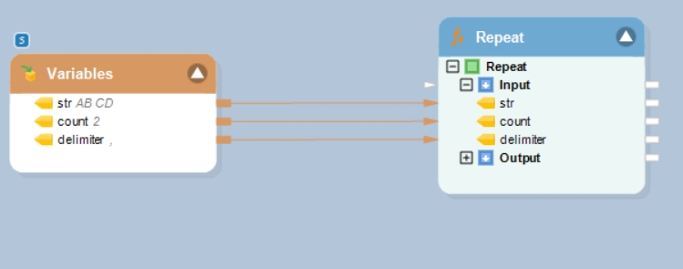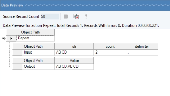 Right-click on the function transformation object and select Preview Output. You can see that the characters specified in the str data field are repeating two times, separated by the given delimiter.