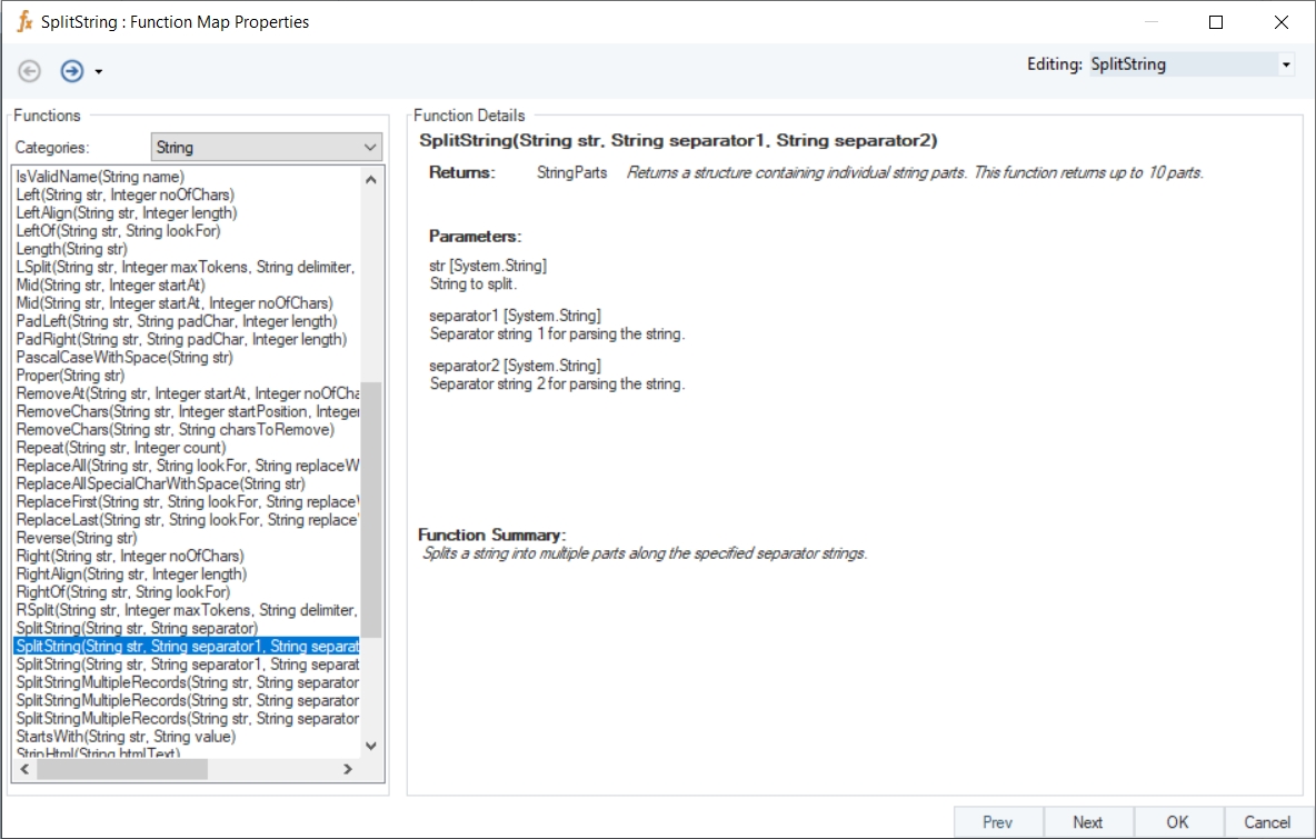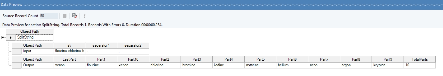 Right-click on the function transformation object and select Preview Output. You can see that Astera Data Stack has split the string into 10 parts based on the given separators.