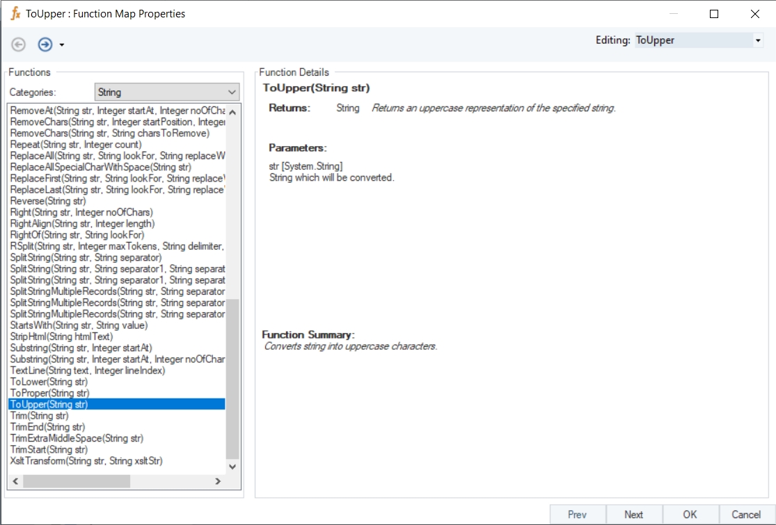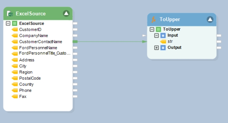In this example, we have customers data stored in an Excel sheet. We want to convert CustomerContactName into uppercase. So, we will map the CustomerContactName data field to str data field under the Input node inside the function transformation object.
