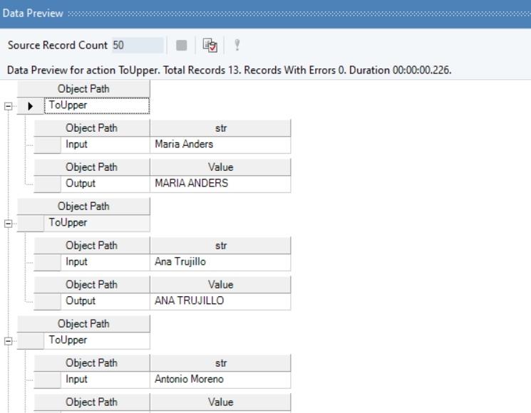Right-click on the function transformation object and select Preview Output. You can see that the value inside the data field has been converted into uppercase.