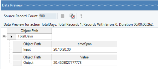 In the output window, you can see that the timespan value has been converted into a real value, indicating the total number of days present in the timespan value.