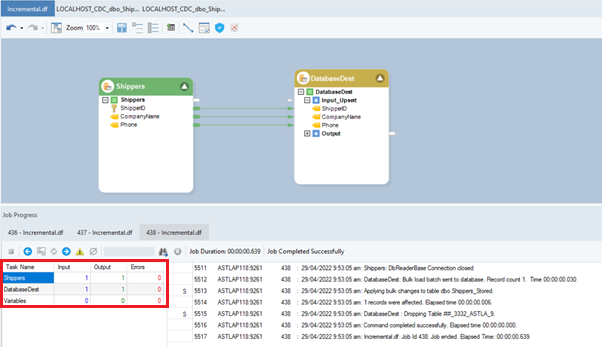 Upon running the dataflow, you can see in the Job Progress that the database table source object has not registered any data and therefore the destination is not updated. The update is not considered, as the value of the Audit Field in this case, ShipperID stored in the CDC file is the same as it was in the last run.