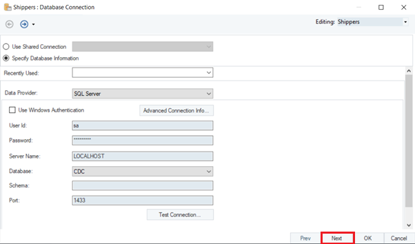Next in the Define Input Ports for Mapping section select the Individual Ports for Actions and then further select the Upsert checkbox as we require new entries to be stored in the destination. In the Select Fields for Matching Database Record select the ShipperID which is also the primary key and is unique for each record in our database table.