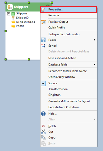 Firstly, to access the Properties for the Database Table Source object, right-click on its header and select Properties from the context menu.