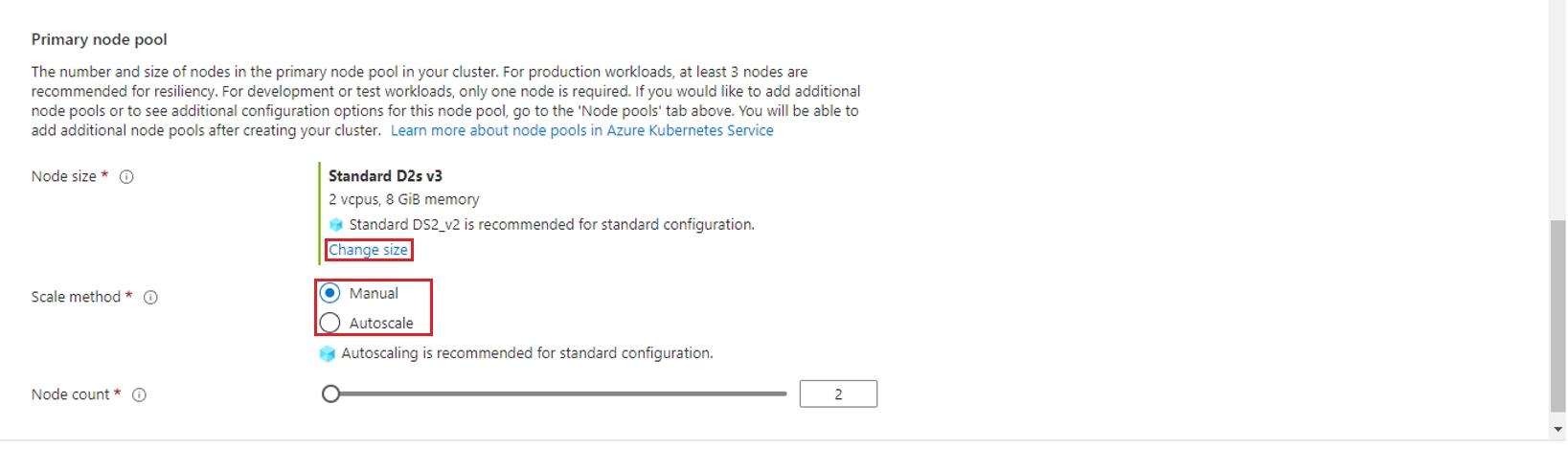 Select the primary node pool’s Node Size, and Scale Method as described below.