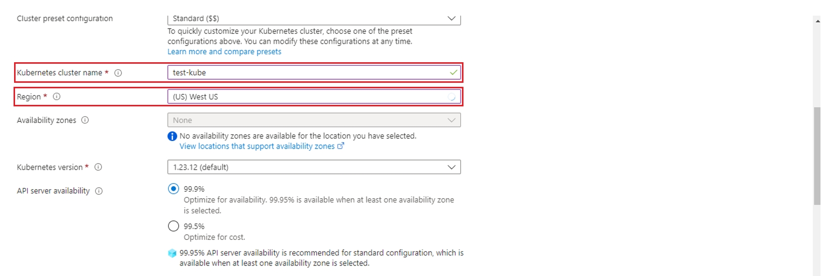 Next, provide the Kubernetes Cluster name. Also, specify the Region based on where the resource group is created.