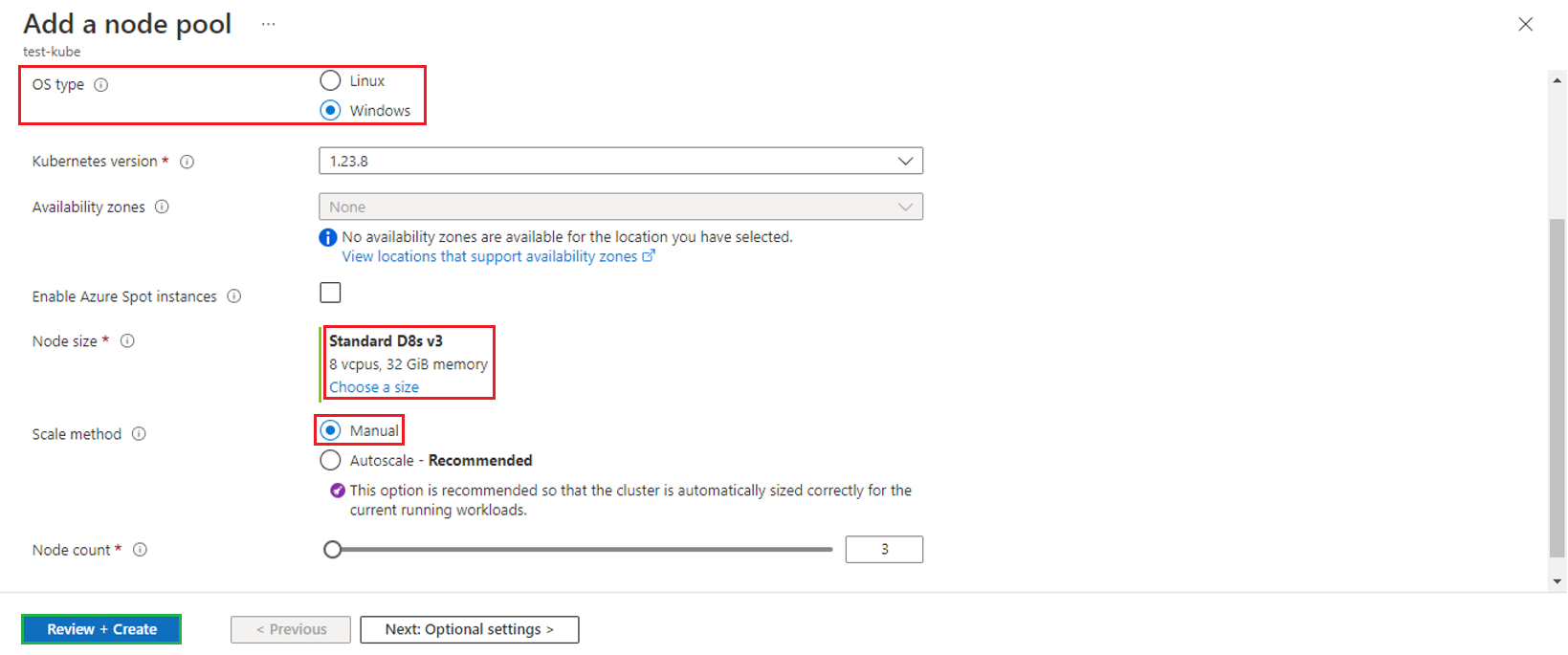 Now add a node pool, name it, select User mode and OS. Also select Machine size and scaling method as illustrated below.