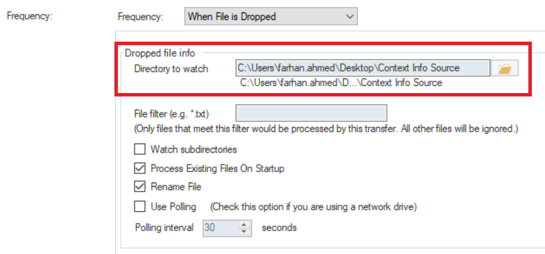 Now, all that is left is to schedule this job to run whenever a source file is dropped into a specified folder. For this, we have selected the When File is Dropped option under the Frequency section of the Job Scheduler.