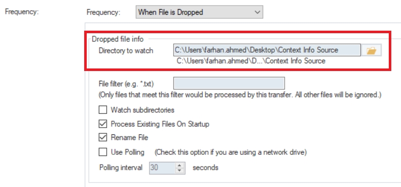 DroppedFilePath: Path to the file being dropped, in case of a scheduled job of type ‘When File is Dropped’