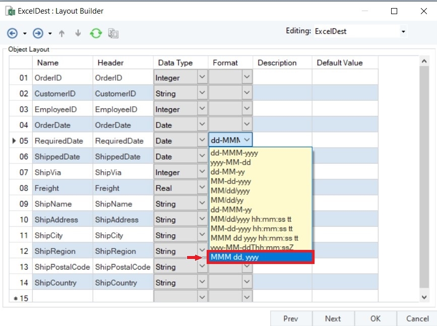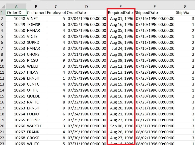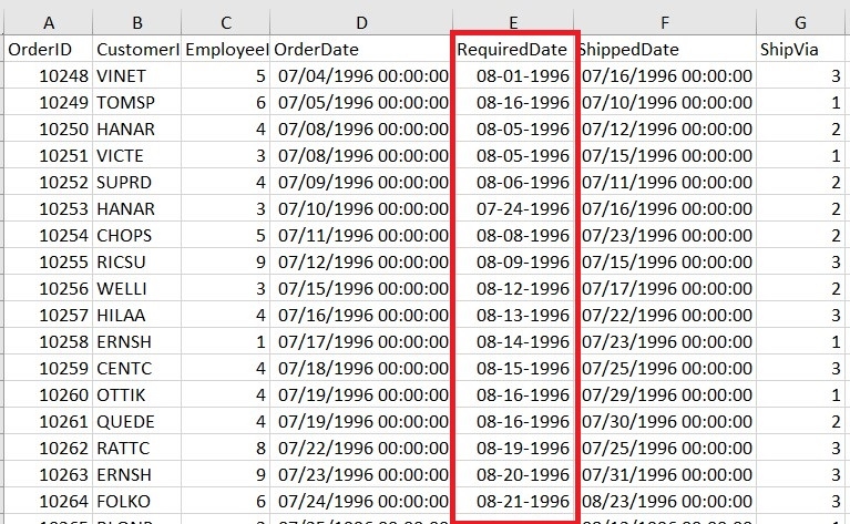 After selecting this new format, we’ll save the configuration settings and run the dataflow. The Excel file created will now have the new data format for the RequiredDate field: