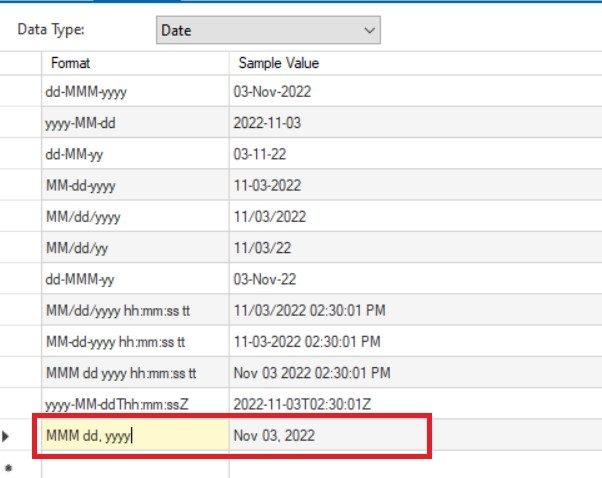 After selecting the data type, double-click on the last blank row in the Format column to enable editing. In this example, we’ll work with the Date data type and add the new format MMM dd, yyyy: