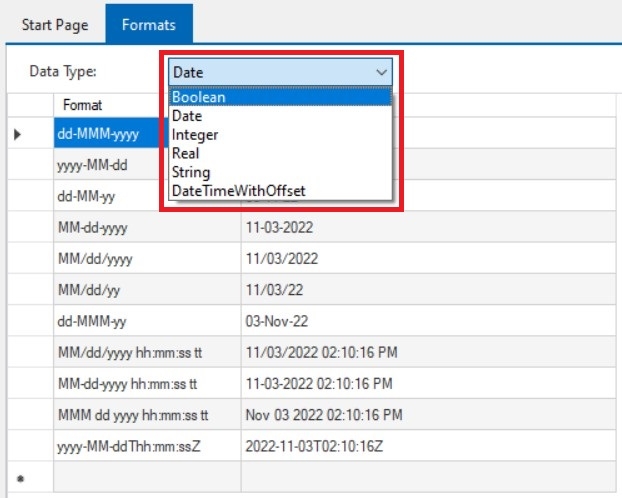This will open the Formats tab where we can see all the pre-configured formats for different data types supported by Astera.
