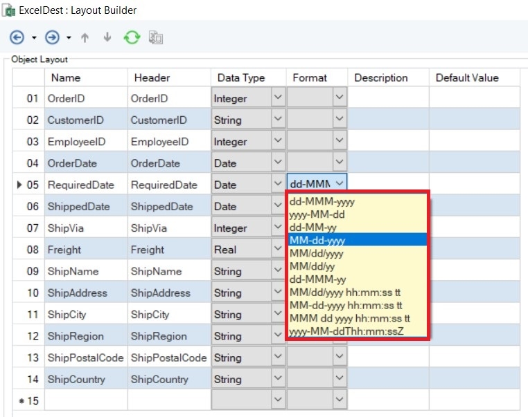 To change the data format of your desired field, select one of the formatting options from the drop-down list in the Format column. Here we can see all the pre-configured options provided by Astera. In this example, we’ll choose MM-dd-yyyy: