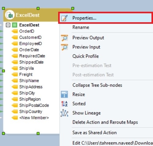 To configure the Excel Workbook Destination object, right-click on the header and select Properties from the context menu: