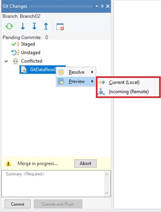 Incoming (Remote): Selecting this will preview the conflicting file in the second branch which is to be merged into the current branch.
