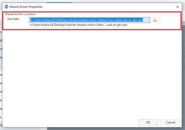 To edit the Shared Action file path, double-click the Shared Action object. You can select a new path by clicking on the File (📂) icon under the Shared Action Location section of Shared Action Properties window.