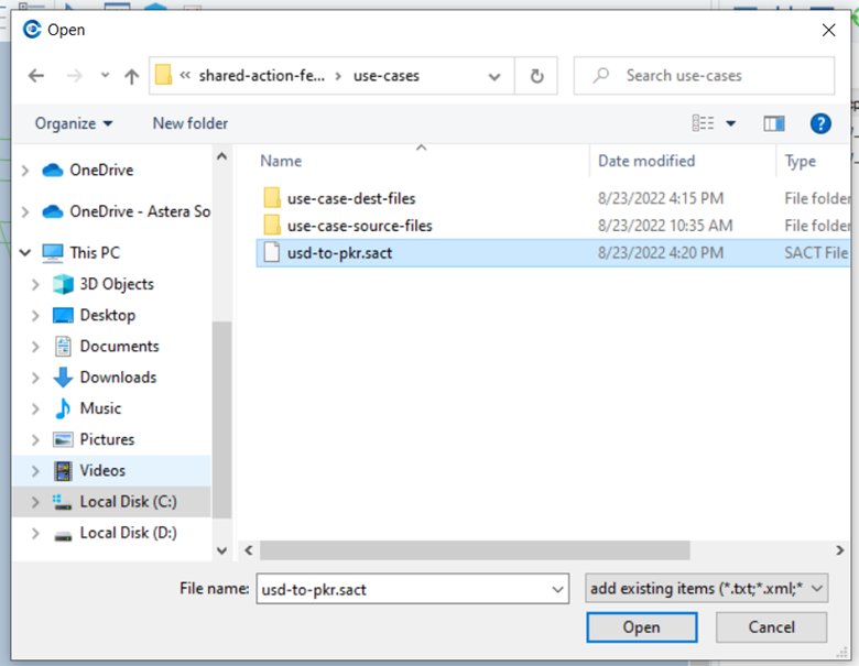Select the Shared Action file you created from the file explorer window that appears. Click Open.