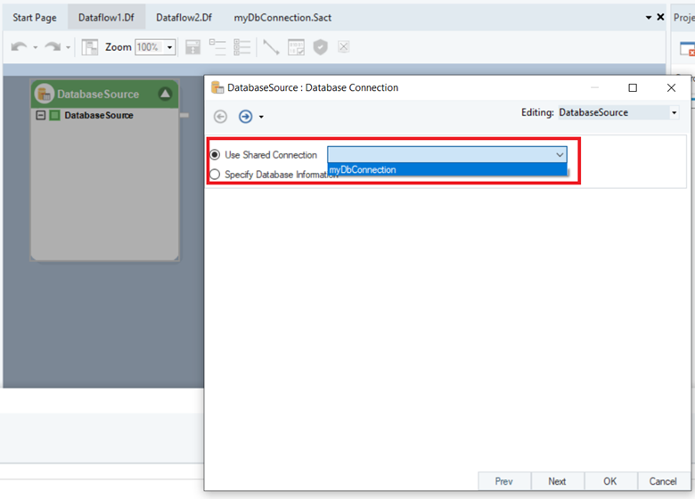 Open a dataflow that uses a DatabaseSource object within your project. Open the DatabaseSource properties window by double-clicking on it.