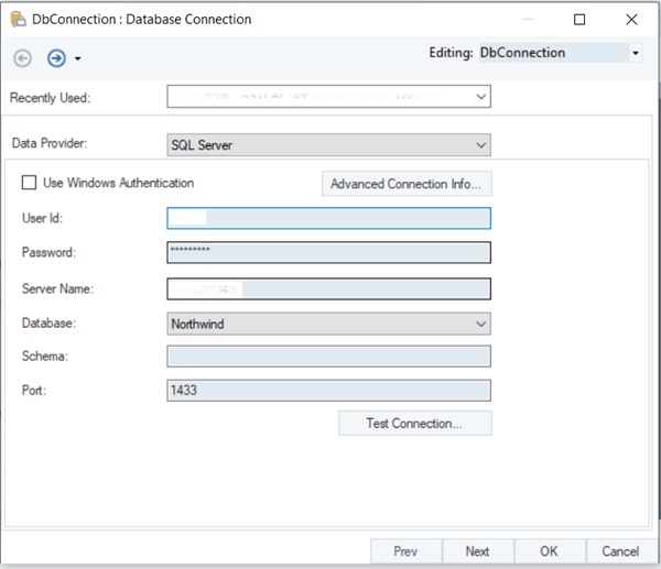 Double-click the DbConnection Object. A DbConnection properties window will open. Add database connection details and click OK.