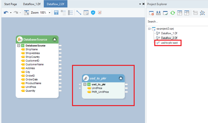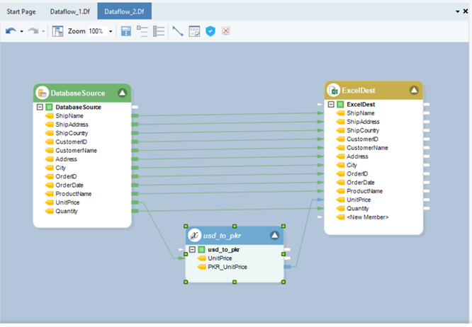 The following dataflow extracts data from a database table using a DatabaseSource object and converts the unit price of an item from USD to PKR using an expression. It then writes the data to an Excel Destination.