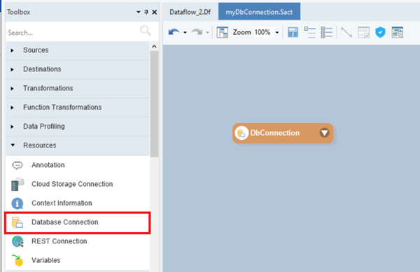Note: The Database Connection shared action can be used with any other object that supports the usage of shared connections. Some examples of these objects include the SQL Statement Lookup and SQL Query Source objects in a dataflow and the Run SQL Script and Run SQL File objects in a workflow.