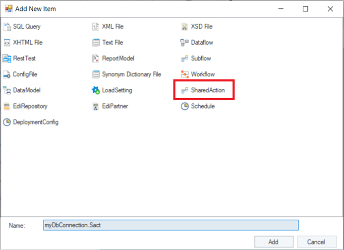 An Add New Item window will open. Select a SharedAction item from the window. Rename your SharedAction item and click Add.