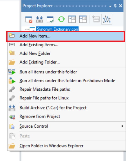 1. In the Project Explorer panel, right-click on the object in the project tree where you want to add a synonym dictionary file and select Add New Item > Synonym Dictionary File.
