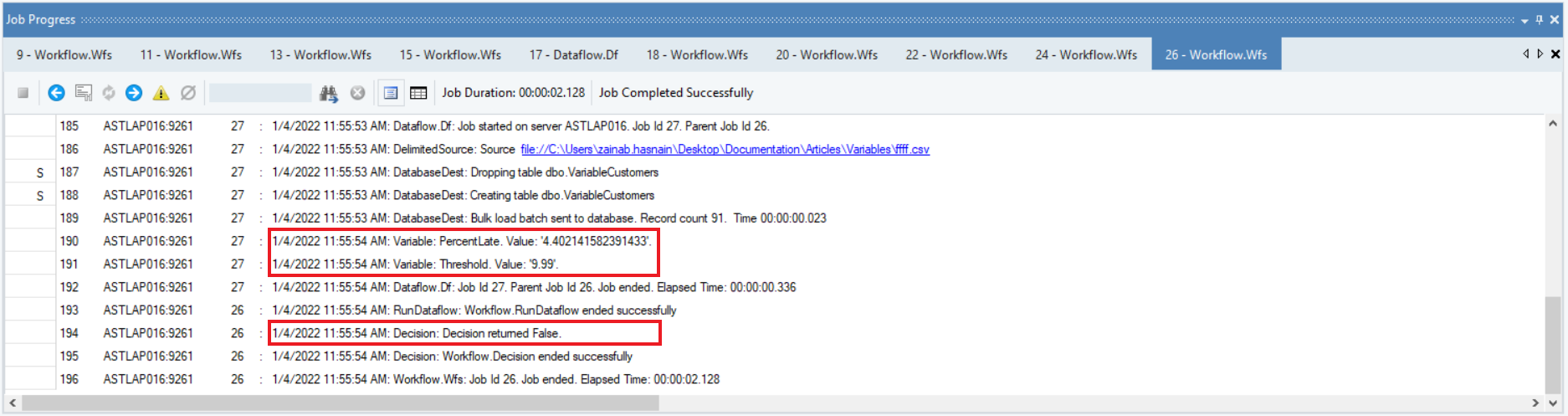 If the PercentLate is greater than the defined Threshold, our Decision object will return True, and the SendMail task will be executed. Here is a job trace of the workflow: