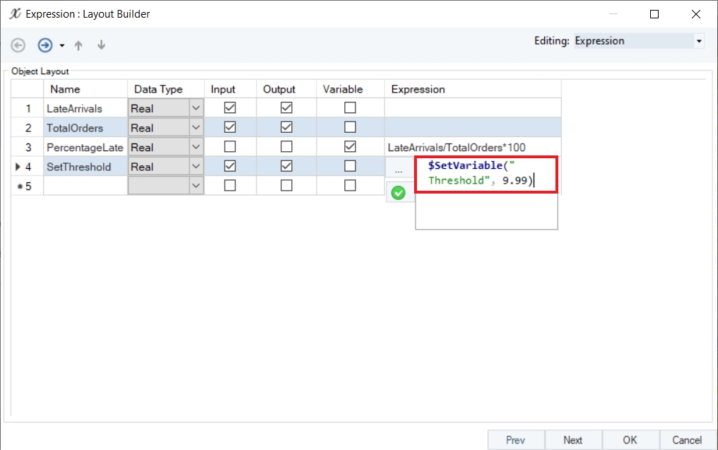 6. To set the value of the variable, Threshold, we will create a new variable, SetThreshold and use the $SetVariable(String Variable, Any Value) function in the Layout Builder of the Expression object. Make sure to specify the parameters of the function with the correct syntax.