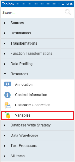 1. Drag-and-drop the Variables object from the Resources section of the Toolbox onto the designer.
