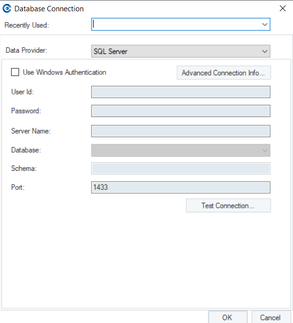 This button opens the Advanced Connection Info dialog box. This is where a user can specify database specific settings such as connection and command timeout.