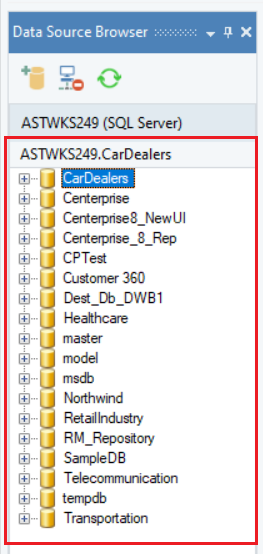 The Data Source Browser enables you to connect to and query data from a database server. Astera allows you to connect to multiple database servers at the same time.