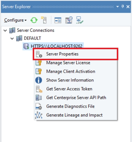 To configure the Cluster Database Repository settings, right-click on the added Server in the Server Explorer Panel. Here, click on the Server Properties option.