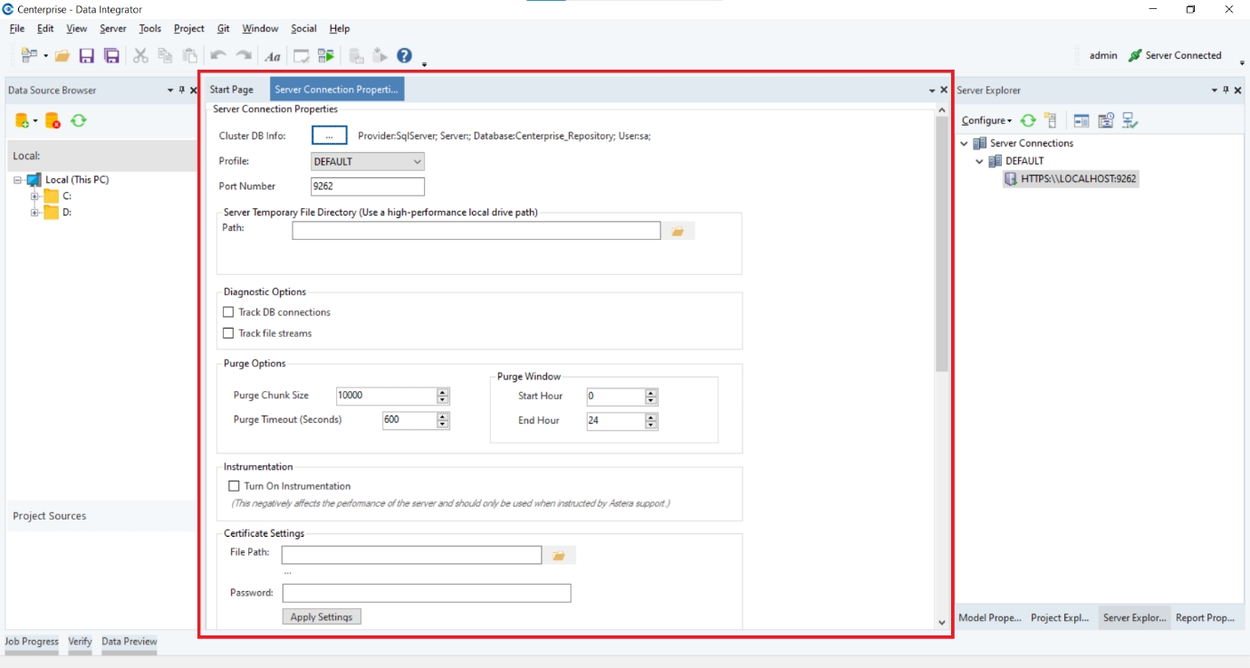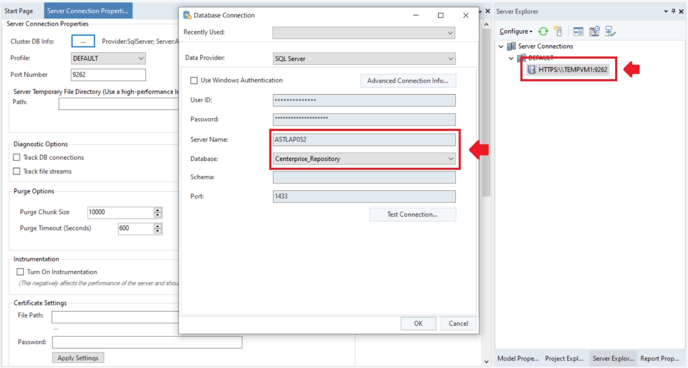 This opens the Server Connection Properties. Here, we can configure the Cluster Database Repository to point towards a specific repository.