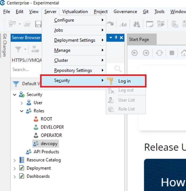In the Server Explorer panel, navigate to the Connect to Server button. This allows you to connect to and configure a server in Enterprise Client.