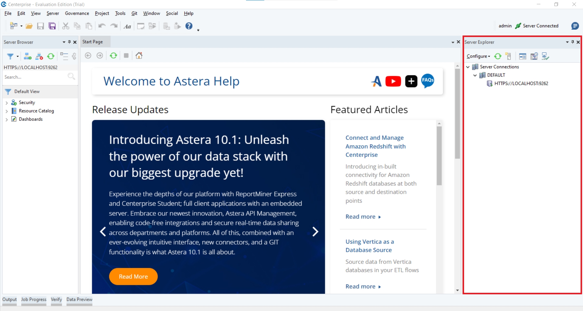 To configure a server in the Enterprise Client, navigate to the Server Explorer panel. The Server Explorer contains information about your Cluster(s) and Server(s).