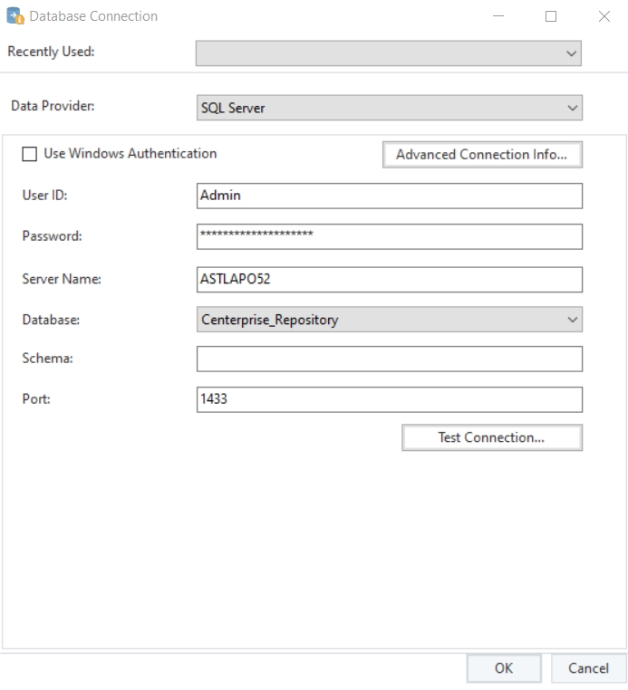 The Database Connection dialog box allows us to configure the Cluster Database Repository settings. Choose the type of database you are using (SQL Server or PostgreSQL) from the Data Provider drop-down list. Enter the credentials required to connect to the database. Select the database you will use for the repository from the drop-down list next to the Database option. The Server Name option allows you to enter the specific server instance where your repository is available. You can add the Server Name or IP Address of the specific server you want to use here. However, it is to be noted that the server must be on the same network as the client machine for this to work.