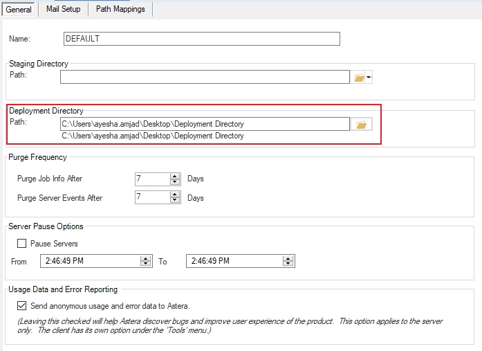 In the general settings tab, specify the Deployment Directory path. The Deployment Directory is the location where the deployment files will be stored for the server to access when a deployment schedule is run.