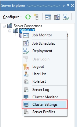 On the Server Explorer panel, right-click on the DEFAULT server node, and select Cluster Settings.