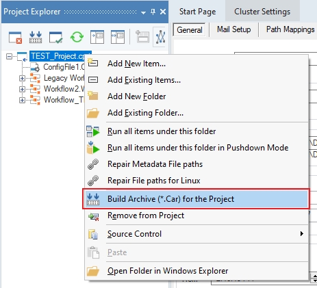 In the Project Explorer panel, right-click on the Project node, and select Build Archive (.Car) for the Project from the context menu.