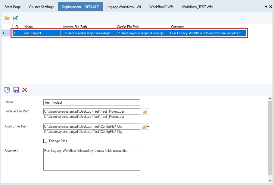 Multiple deployments can be configured on the cluster from the deployment window. The top part of the deployment screen shows the configured deployment files.