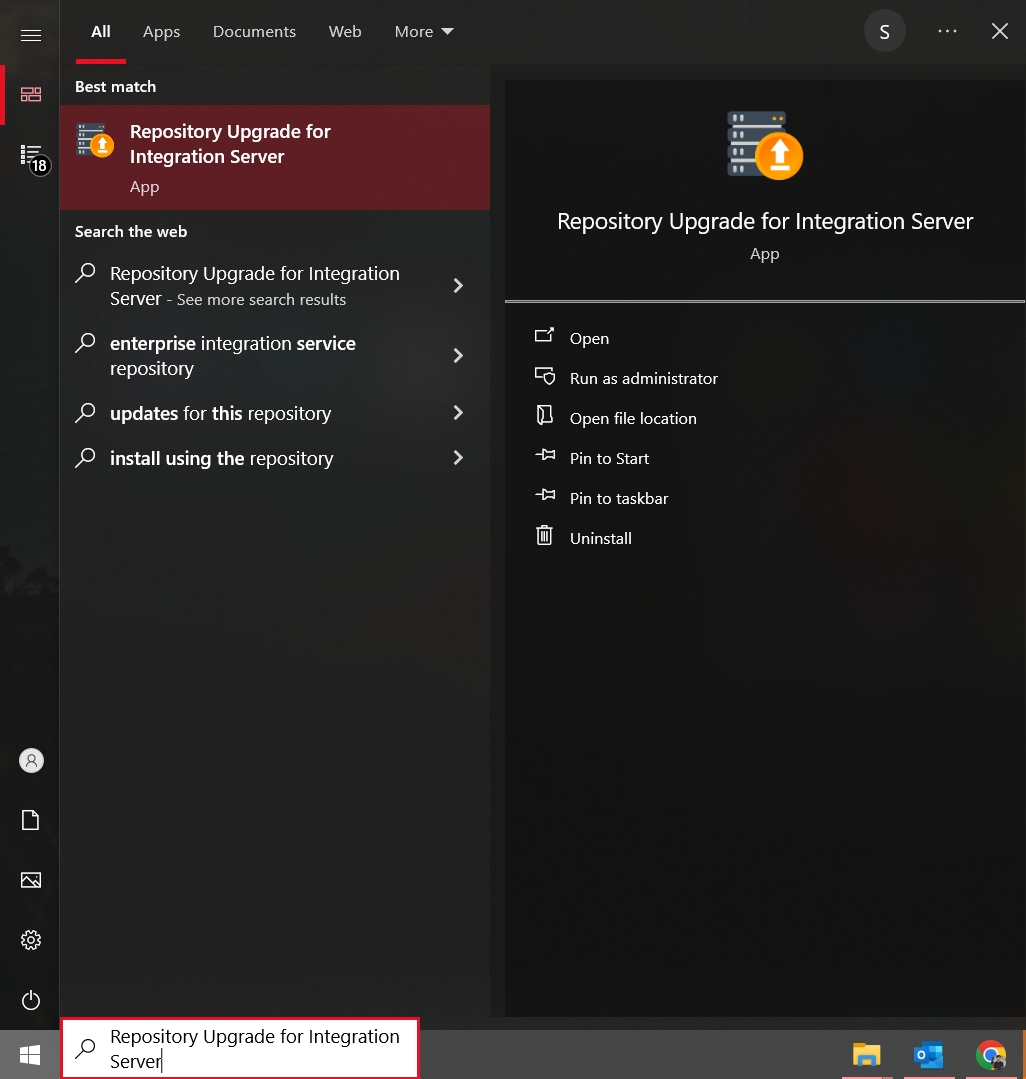 Go to the windows search bar and type "Repository Upgrade for Integration Server".