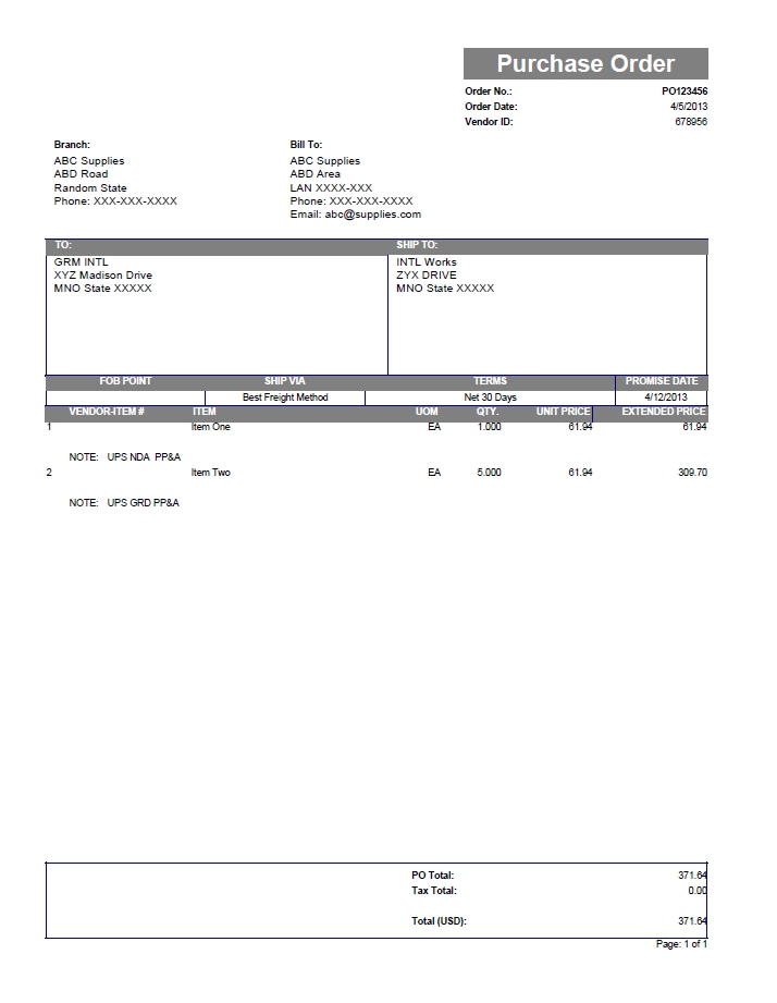 4. Ensure that the documents that are being used have a layout where the first data region has key-value pairs followed by a table and the last region being a key-value pair region as well. For example, the purchase order shown below follows such a layout.