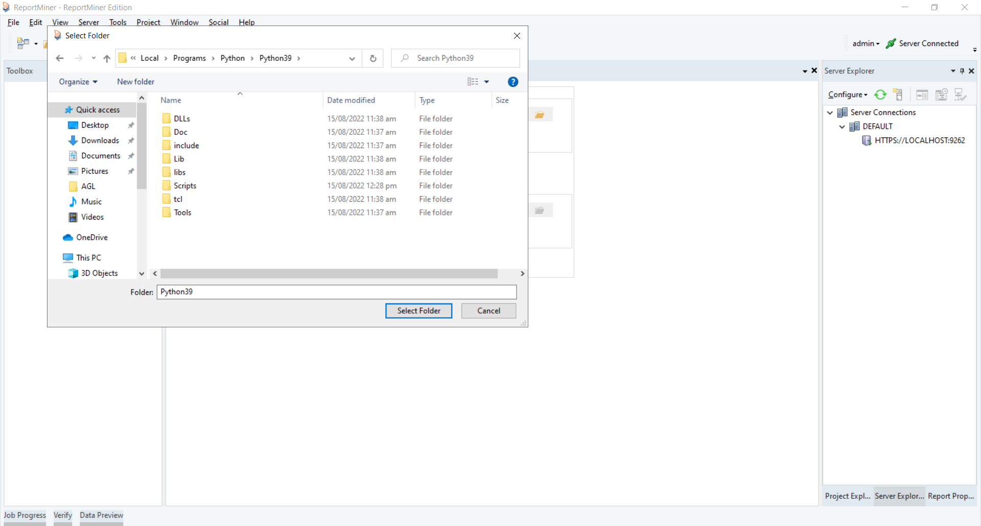 4. Provide the path of the Python39 folder in the File Path textbox. With the default directory installation, the file path would be C:\Users{username}\AppData\Local\Programs\Python\Python39.