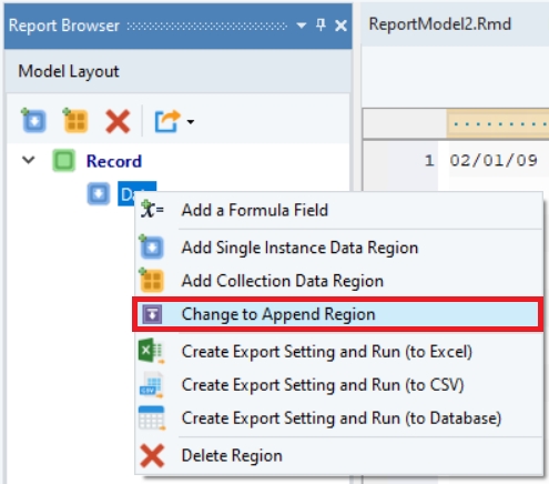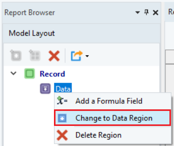 To change your append region to a data region, right-click on the append data region in the Model Layout panel and select the Change to Data Region option from the context menu.